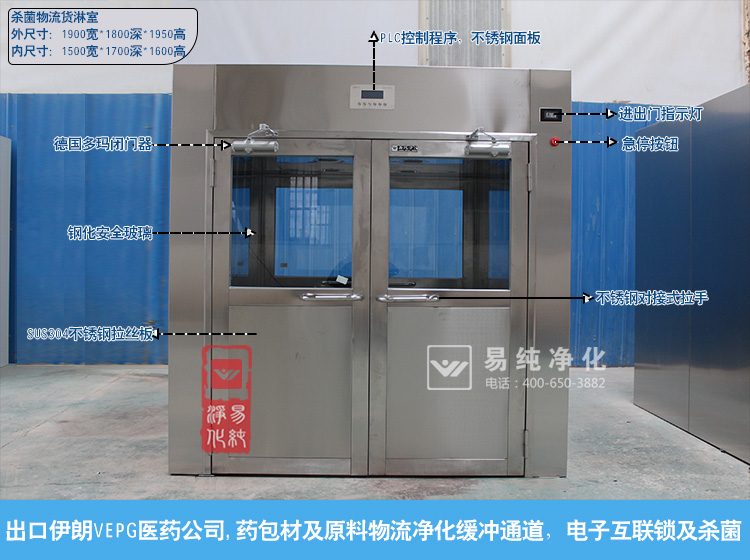 貨淋室門電子互鎖,可以兼起氣閘室的作用,防未被凈化的空氣進入潔凈室,達到有效的凈化效果,經高效過濾器過濾后的潔凈氣流由可旋轉噴嘴從各個方向噴射至物體表面,有效而迅速清除塵埃粒子,帶有塵埃粒子的空氣再由初、高效過濾器過濾后重新循環到風淋區域。